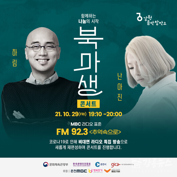 강원음악창작소가 오는 29일 금요일 오후 7시 10분 MBC 라디오(FM92.3)를 통해‘북‧마‧생 나눔콘서트’를 개최한다.