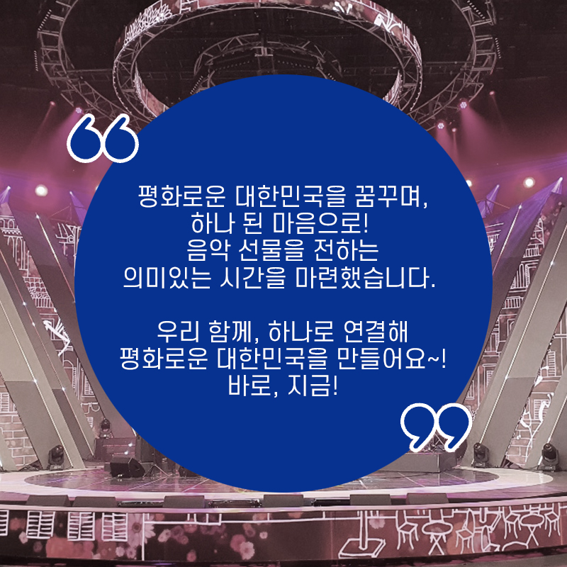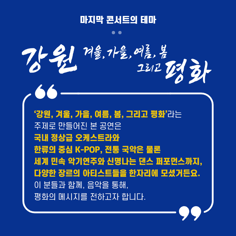 평화지역을 배경으로 평화·화합메시지를 담은 특색 있는 음악 프로그램을 제작하고자 이번 콘서트는 K-POP, 국악, 합창, 댄스 퍼포먼스 등 다양한 장르의 종합 예술 공연으로 기획되었으며, 프라임필하모닉 오케스트라(지휘자 김봉미)와 성악가 신문희, 인기 아이돌인 오마이걸·펜타곤, 뮤지컬배우 민우혁, 세계적인 댄스팀 저스트절크 등 총 113명이 출연하였다.