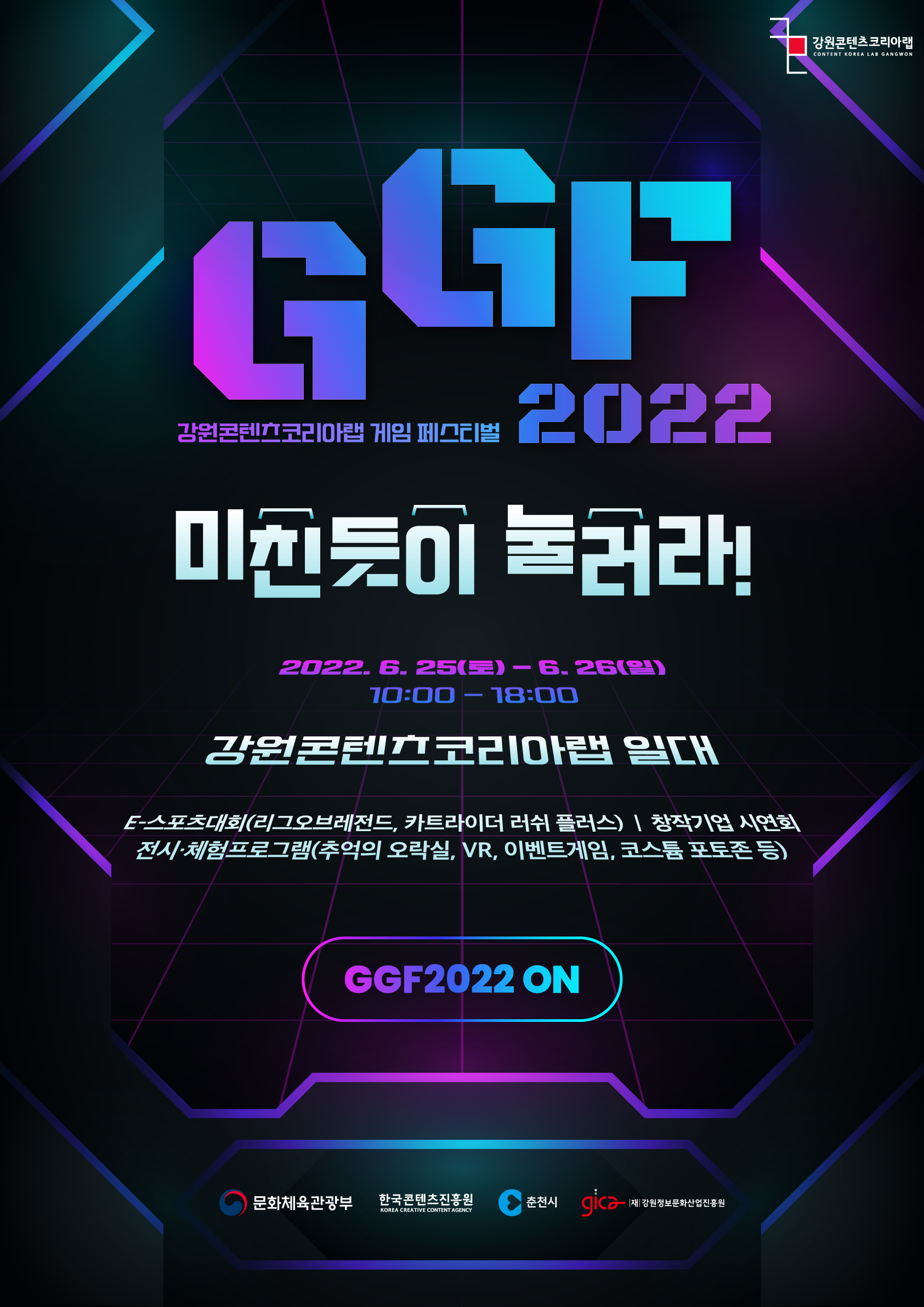 ‘2022 강원콘텐츠코리아랩 게임 페스티벌은’ 이틀간 10시부터 18시까지 진행되며, 강원콘텐츠코리아랩 일대에서 즐길 수 있다.