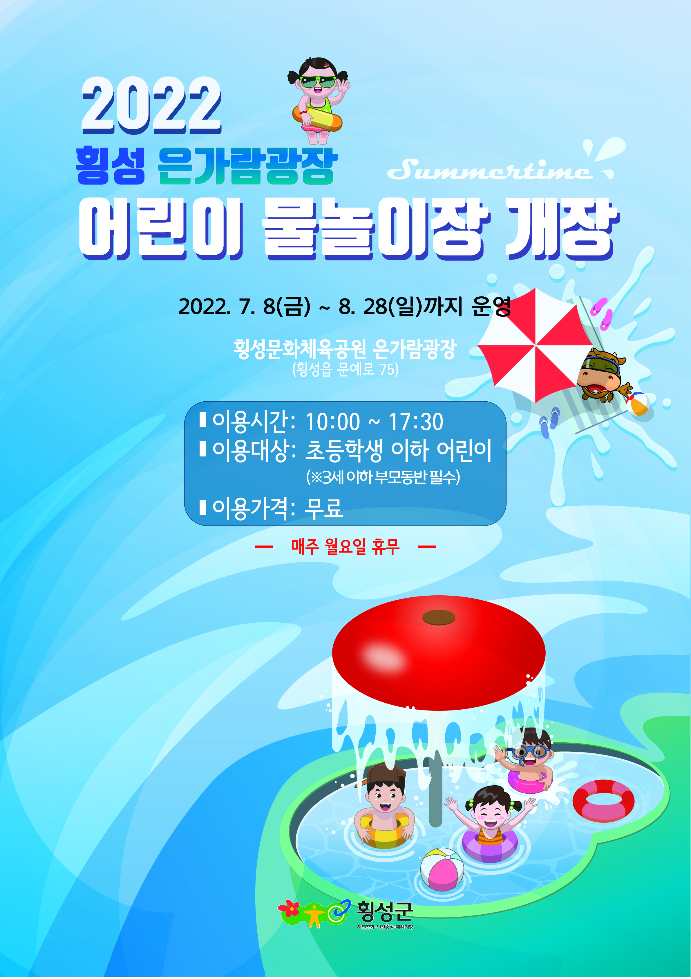 횡성군은 7월 8일부터 8월 28일까지 횡성문화체육공원 내 은가람광장 어린이 물놀이장을 운영한다고 밝혔다.