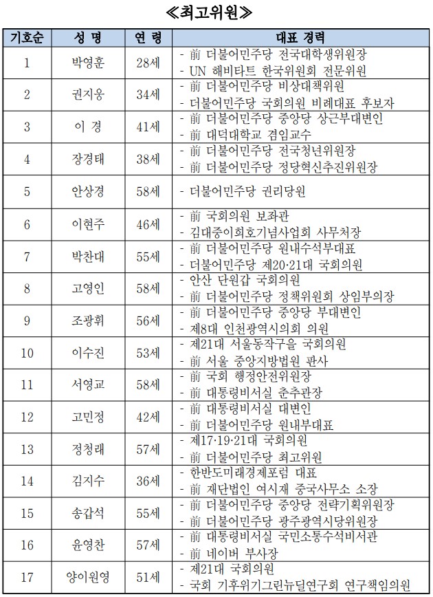 최고위원 선거에는 총 17명이 출사표를 던졌다. 박영훈 전 대학생위원장, 권지웅 전 비대위원, 이경 전 부대변인, 장경태 의원, 안상경 권리당원, 이현주 전 보좌관, 박찬대 의원, 고영인 의원, 조광휘 전 부대변인, 이수진 의원, 서영교 의원, 고민정 의원, 정청래 의원, 김지수 한반도미래경제포럼 대표, 송갑석 의원, 윤영찬 의원, 양이원영 의원(이상 기호 1-17번 순)이다.