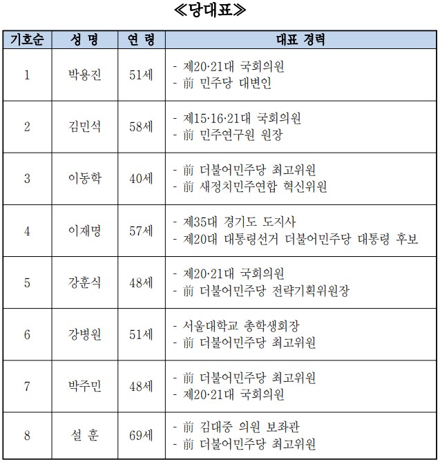 당대표 후보는 박용진의원, 김민석 의원, 이동학 전 최고위원, 이재명의원, 강훈식의원, 강병원의원, 박주민의원, 설훈 의원(이상 기호 1-8번 순)이다.