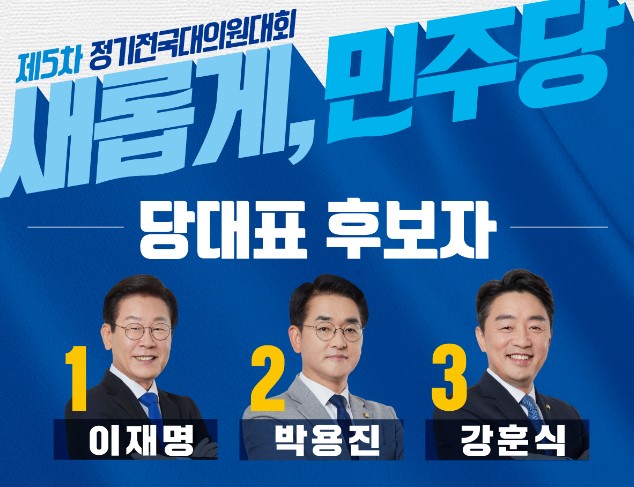 28일 민주당은 당대표 본경선 후보로 박용진, 이재명, 강훈식 3명을 결정했다. 내달 6일부터 전국을 순회하고, 8월 28일 전당대회에서 당대표를 최종 선출한다.