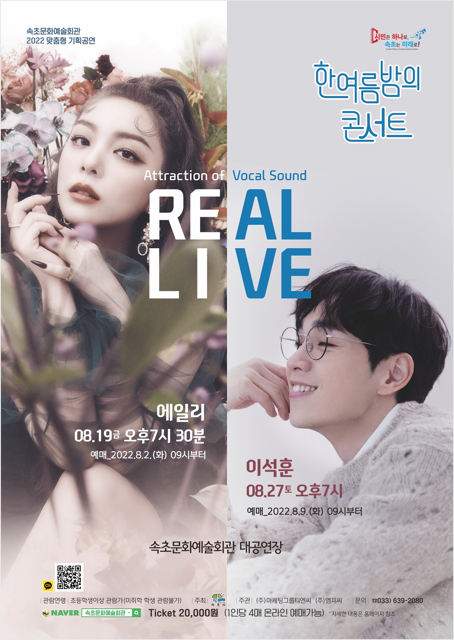 속초시는 8월 19일 금요일 오후 7시 30분, 8월 27일 토요일 오후 7시, 2주에 걸쳐 속초문화예술회관 대공연장에서 2022년 맞춤형 기획공연으로 ‘REAL LIVE 『한여름밤의 콘서트』’를 개최한다.
