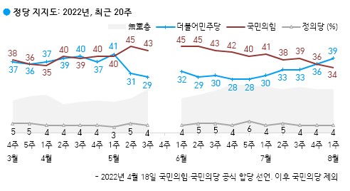 <정당 지지도: 더불어민주당 39%, 국민의힘 34%, 무당(無黨)층 23%>