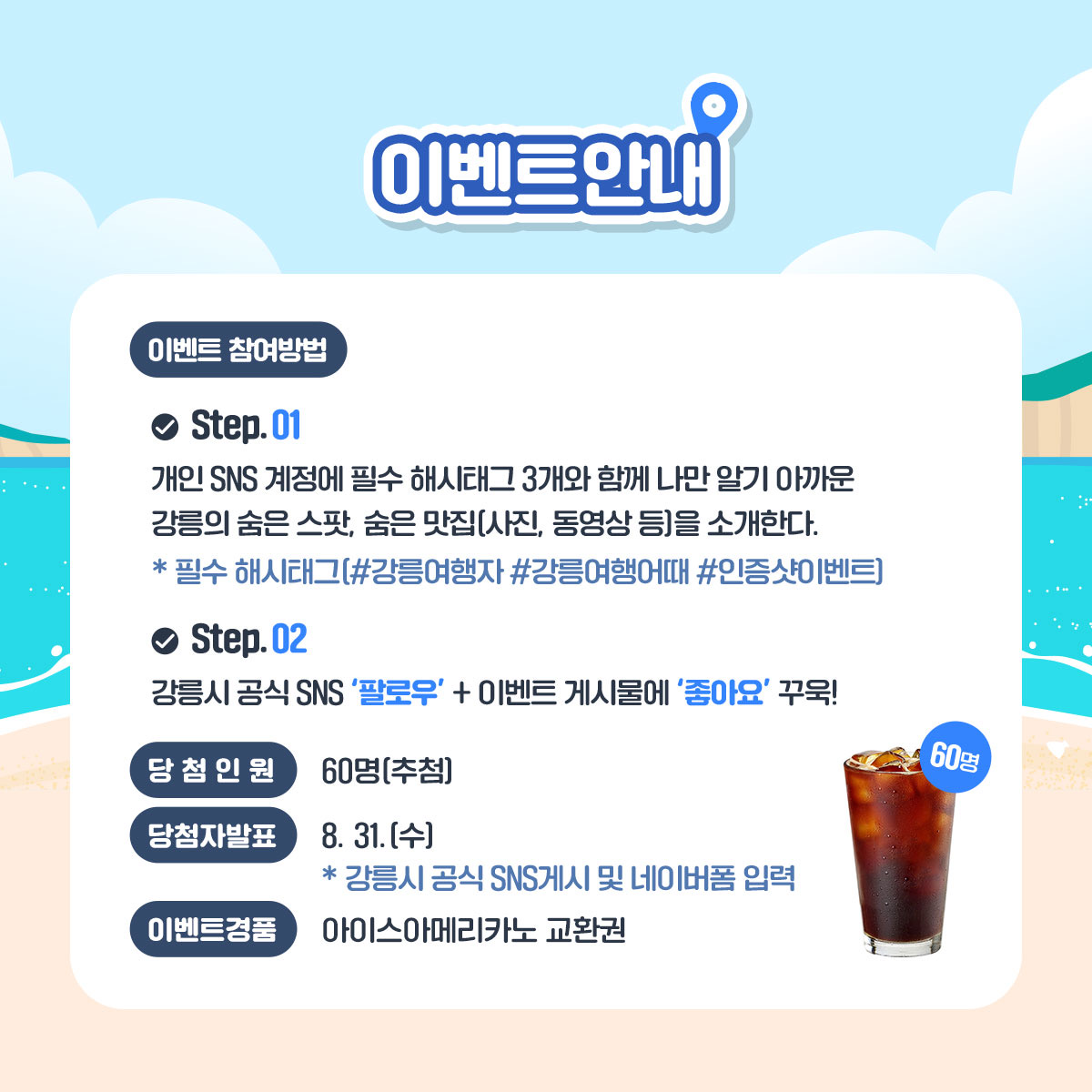 이벤트 결과는 31일(수) 공식 SNS에 게시되며, 당첨된 총 60명에게는 아이스아메리카노 기프티콘이 지급된다. 자세한 내용은 강릉시 공식 페이스북과 인스타그램에 안내되어 있다.