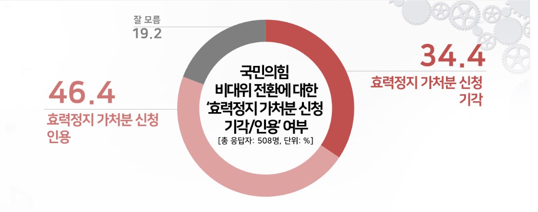 결과는 '효력정지 가처분 신청은 인용되어야 한다’는 응답이 46.4%, '효력정지 가처분 신청은 기각되어야 한다’는 응답은 34.4%로 나타났다. 인용 응답이 기각보다 12.0%포인트 더 높게 나타났다.