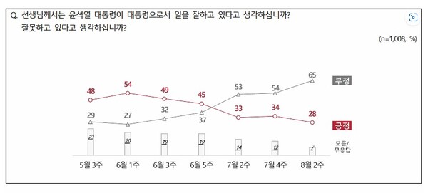8월 11일 전국지표조사(NBS : 엠브레인퍼블릭ㆍ케이스탯리서치ㆍ코리아리서치ㆍ한국리서치)에 의하면 윤석열 대통령의 국정운영에 대해 ‘잘하고 있다’라는 긍정적 평가는 28%, ‘잘못하고 있다’라는 부정적 평가는 65%로 나타났다. 7월 4주와 비교하면 ‘긍정적 평가’가 6%p 감소했으며, ‘부정적 평가’는 11%p 상승한 것으로 나타났다.