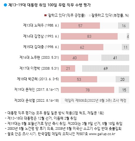 한국갤럽 자료에 의하면 제13~19대 대통령 취임 100일 무렵 직무 평가를 보면, 역대 대통령들의 취임 100일 무렵 직무 수행 긍정률은 제13대 노태우 57%(1988년 6월), 제14대 김영삼 83%(1993년 6월), 제15대 김대중 62%(1998년 6월), 제16대 노무현 40%(2003년 5월 31일), 제17대 이명박 21%(2008년 5월 31일), 제18대 박근혜 53%(2013년 6월 3~5일, → 데일리 제70호), 제19대 문재인 78%(2017년 8월 16~17일, → 제272호)로 역대대통령 중 윤석열 대통령은 두번째로 낮은 것으로 나타났다.