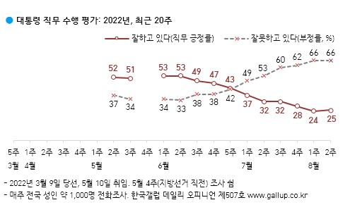 한국갤럽이 2022년 8월 둘째 주(9~11일) 자체조사를 발표했다. 윤석열 대통령이 현재 대통령으로서의 직무를 잘 수행하고 있다고 보는지 잘못 수행하고 있다고 보는지 물은 결과, 25%가 긍정 평가했고 66%는 부정 평가했다.