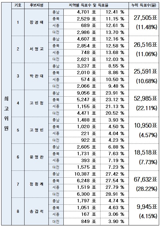 이재명 후보는 권역별로 강원 74.09%, 대구 73.88%, 경북 77.69%, 제주 70.48%, 인천 75.40%, 부산 73.69%, 울산 77.61%, 경남 75.53%, 충남 66.77%, 충북 74.09%, 세종 76.22%, 대전 73.84%의 득표율을 기록했다.