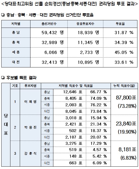 <충북 충남 대전 세종 순회경선> 이재명, 누적 73.28%로 압도적 1위 본문