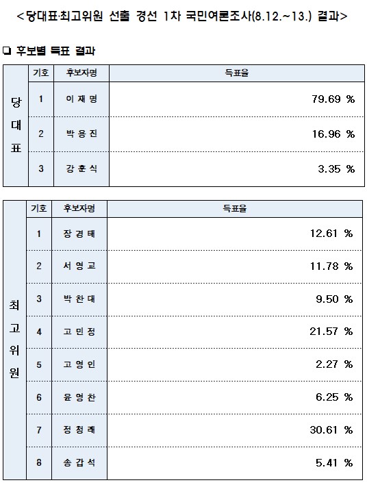 이날 같이 발표된 첫 국민 여론조사 결과는 이재명 후보가 79.69%로 권리당원 득표율보다 더 많이 받았다. 박용진 후보는 16.96%, 강훈식 후보는 3.35%를 기록했다.