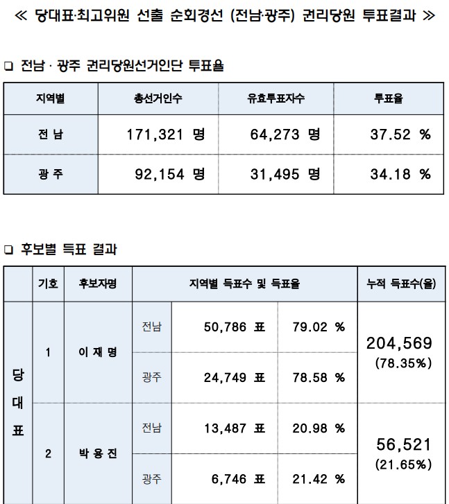 8월 21일 더불어민주당 전당대회 광주전남 순회경선 결과가 발표되었다. 예상대로 이재명 후보가 전북에 이어 전남, 광주에서도 압승을 거두며 호남에서도 대세론을 이어갔다. 최고위원은 정청래, 고민정, 서영교, 장경태, 박찬대 순으로 당선권 5명에 변동은 없었다.