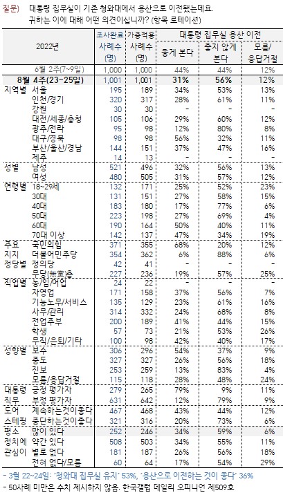 ◇ 대통령 집무실 용산 이전, 긍정 31%, 부정 56%로 부정 여론 증가
