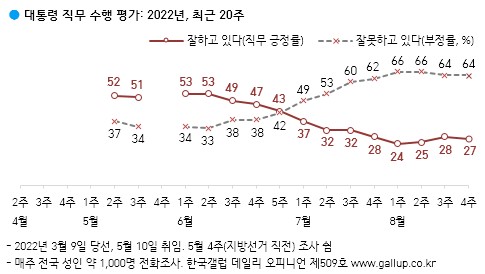 한국갤럽이 8월 4주차 정기조사를 발표했다. 윤석열 대통령 '잘하고 있다' 27%, '잘못하고 있다' 64%로 지난주보다 잘못하고 있다가 1%p 하락했다. 몇몇 조사에서 반등하는 듯 했으나 한국갤럽 조사에선 아직 횡보하는 것으로 나타났다.