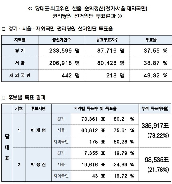 이재명 후보는 고양시 킨텍스에서 열린 서울 합동연설회 후 발표된 경기·서울 권리당원 투표 결과 경기 80.21%, 서울 75.61%를 각각 얻어 누적 득표율 78.22%로 1위를 유지했다. 박용진 후보는 경기 19.79%, 서울 24.39%에 누적 득표율은 21.78%에 그쳤다.