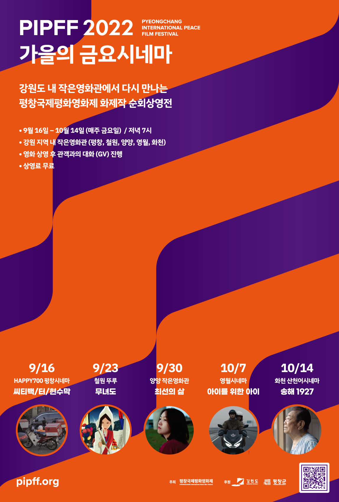 평창국제평화영화제가 지난해에 이어 ‘2022 가을의 금요시네마'를 개최한다. 평창국제평화영화제 상영작 순회상영전으로 한국단편경쟁 부문 수상작들을 비롯해 영화제에서 큰 사랑을 받았던 <무녀도>, <최선의 삶>, <아이를 위한 아이>, <송해 1927> 등이 상영되며, 영화 상영 후에는 감독과의 대화 시간을 진행, 관객들과 함께 소통하는 자리도 마련된다. 평창국제평화영화제와 강원도 내 작은영화관들이 협력한 이번 행사는 평창과 철원, 양양, 영월, 화천에서 매주 금요일 오후 7시에 무료 상영된다.