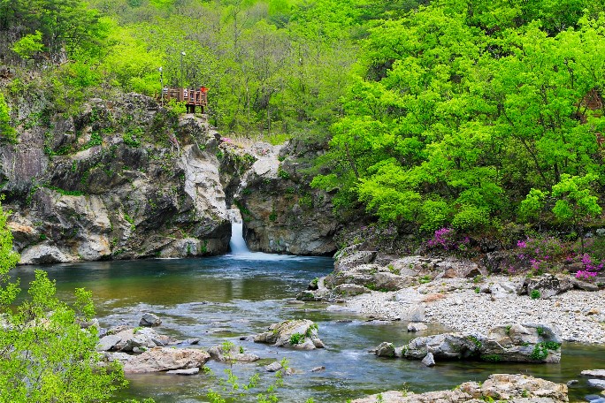 평화의길 두타연은 6.25전쟁 이후 반세기 동안 사람의 발길이 닿지 않았던 자연 생태계의 보고로서 굽이굽이 계곡을 따라 투명한 물과 기암괴석이 조화를 이루는 비경을 자랑한다.