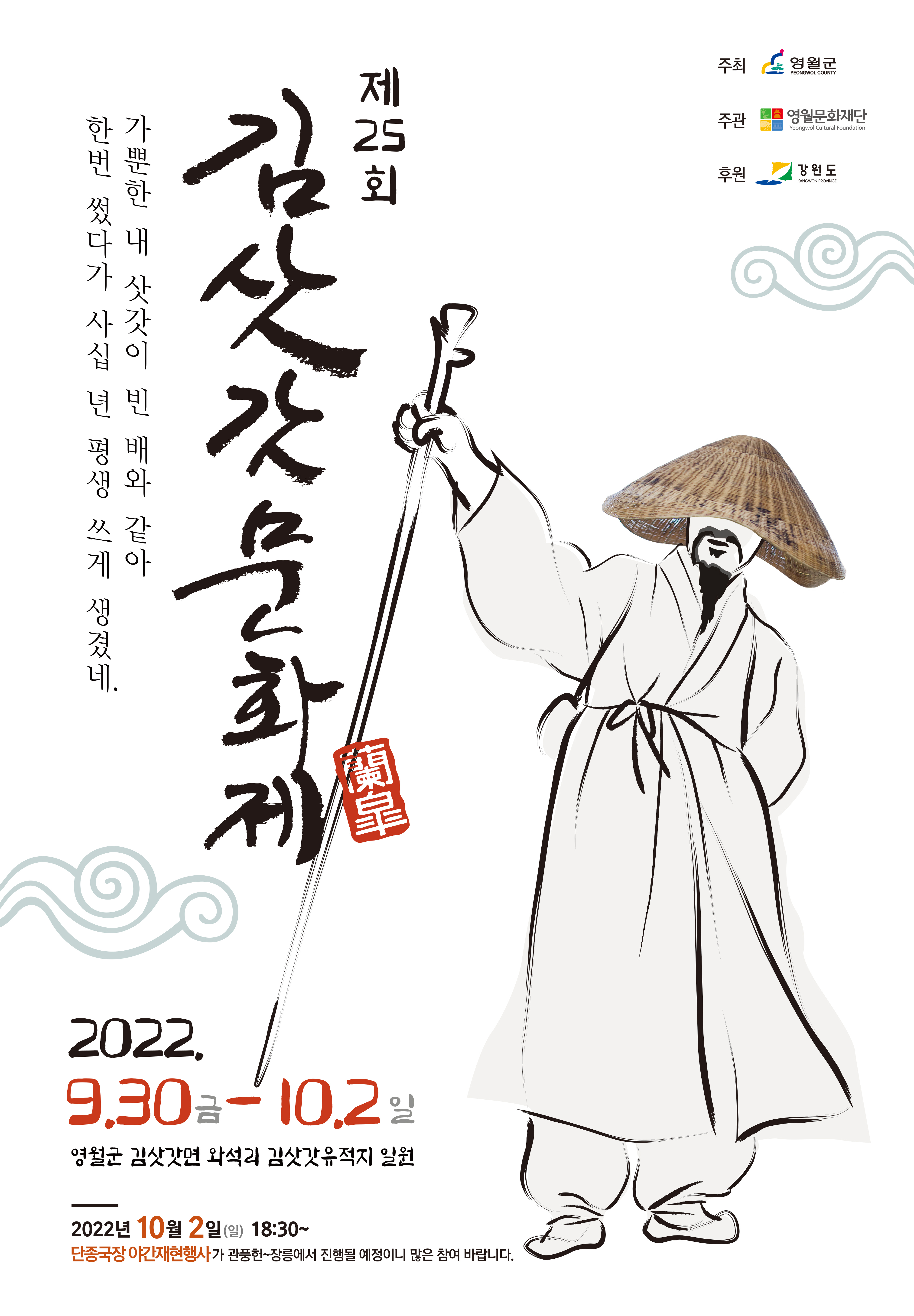 난고 김병연(김삿갓) 선생의 시대정신과 문학예술혼을 추모하고 문학적 가치를 재조명하는 제25회 김삿갓 문화제가 9월 30일(금)부터 10월 2일(일)까지 김삿갓 유적지(영월군 김삿갓면 와석리 소재)일원에서 개최된다.