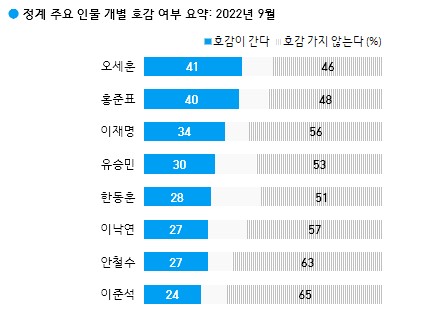 이번 조사에선 주요 인물 8인 각각에 대한 호감 여부를 물었다. 그 결과를 호감도 기준으로 보면 오세훈 서울시장 41%, 홍준표 대구시장 40%, 이재명 더불어민주당 대표 34%, 유승민 전 의원 30%, 한동훈 법무부장관 28%, 이낙연 전 대표와 안철수 의원 각각 27%, 이준석 전 대표 24% 순으로 나타났다.