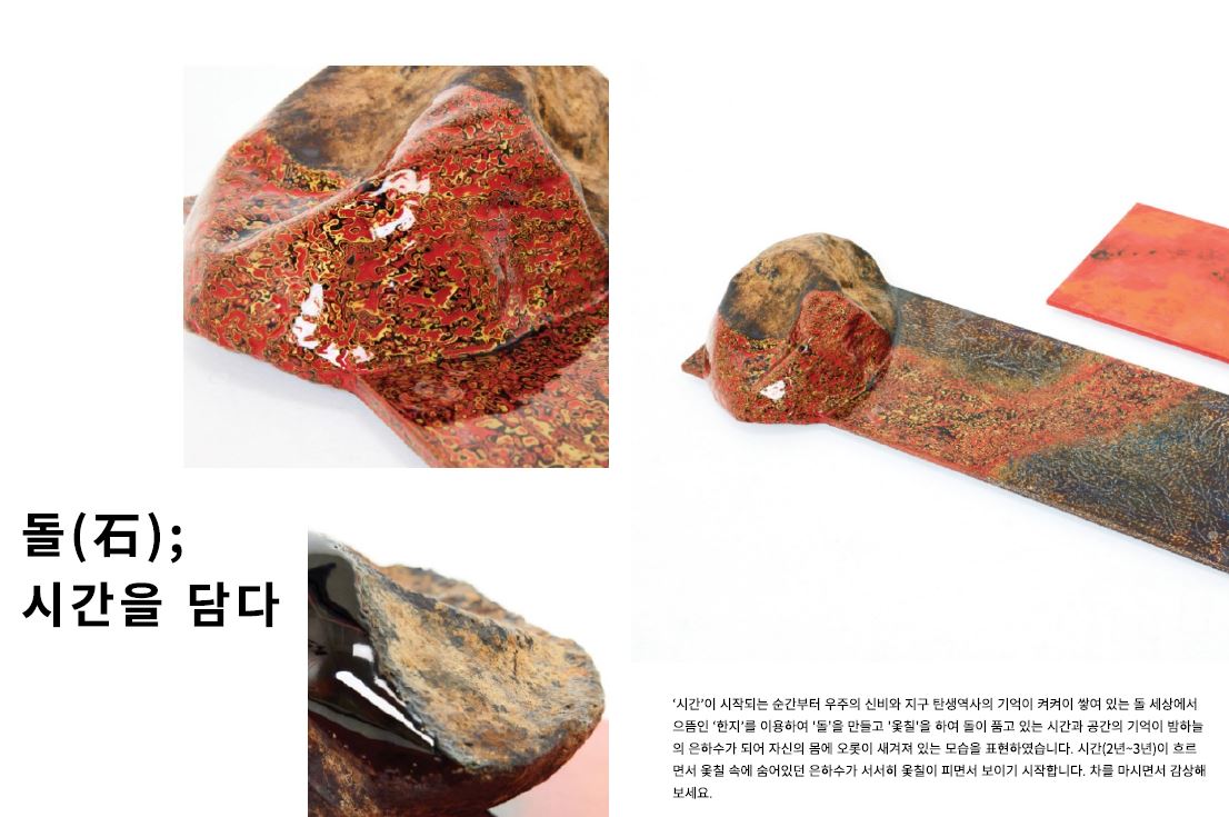 [뜻밖의 정원] 전시는 각 작가의 개성을 엿볼 수 있는 7개 공간으로 이루어져있다. 한지와 옻칠을 주재료로 사용해 ‘돌’을 디자인한 김유 작가, 종이를 이용해 변이된 유전자지도를 재구성하고 조각해 환경오염에 대한 경각심을 표현한 송계영 작가, 인스턴트적으로 소비되는 현재의 시대성과 반하는 ‘한지 지끈’을 재료로 시간을 쌓아올리는 작업을 하는 엄윤나 작가, 환경오염 속에서 인위적인 아름다움으로 덮여가는 지구의 모습을 음악과 영상으로 선보인 미디어아트 그룹 ‘emInSen’, 자연에서 얻은 부산물들과 한지로 조형 작업을 진행한 초남이 홍진 작가, 한지와 닥종이 죽과 백토, 옹기 등으로 자연이 주는 편안함을 표현한 조은미 작가, 자본주의 도시 체계를 구축하고 생산하는 과정에서 건축물들이 어떻게 파생되는지 반투명한 한지로 작업을 진행한 홍유영 작가의 작품을 볼 수 있다.