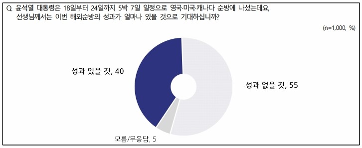 윤석열 대통령의 해외순방에 대해 긍정적 기대는 40%, 부정적 기대는 55%로 나타나, 윤 대통령의 해외순방에 대해 성과가 얼마나 있을 것으로 기대하는지에 대한 질문에 성과가 없은 것으로 답변이 55%로 나타나 부정적인 것으로 나타났다.