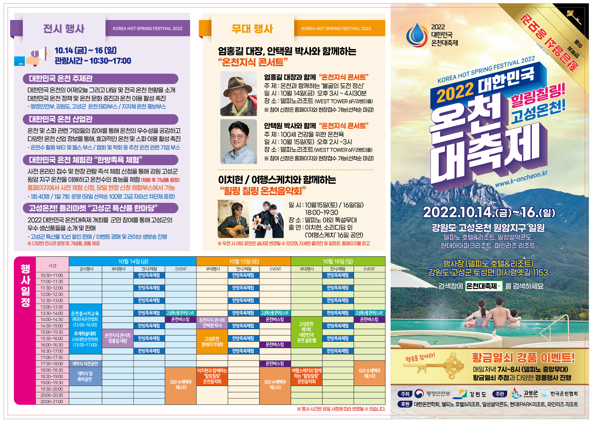 2022 대한민국 온천대축제가 10월14일부터 16일까지 ‘힐링칠링 고성온천’이라는 주제로 강원도 고성군 일원(원암, 인흥 온천)에서 열린다.
