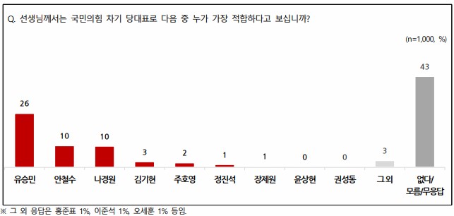 국민의힘 차기 당대표로 누가 적합한가에 대한 질문에 유승민이 26%로 가장 높고, 그 다음으로 안철수 10%, 나경원 10%, 김기현 3%, 주호영 2%, 정진석 1%, 장제원 1% 등의 순으로 나타났다.