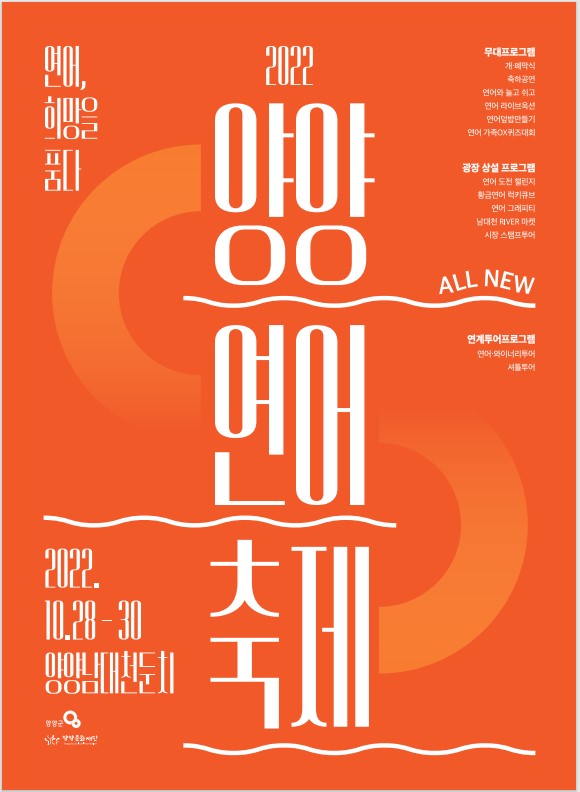며칠 앞으로 다가온 2022 양양연어축제는 가을의 정취와 남대천의 풍경을 담아 다양한 문화공연과 먹거리 및 체험 프로그램 등 다채로운 프로그램이 준비되었으며, 특히 연어축제의 하이라이트인“연어맨손잡기체험”도 남대천 체육공원의 물놀이체험공간을 활용해 편안하고 안전하게 남녀노소 즐길 수 있는 모든 준비를 마쳤다.