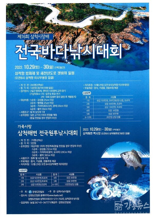 삼척의 아름다운 해안을 감상하며 낚시를 즐길 수 있는 ‘제16회 삼척시장배 전국바다낚시대회’가 10월 29일(토)과 30일(일) 이틀 동안 삼척항 방파제 및 이사부길 갯바위와 삼척해변 일원에서 개최된다.