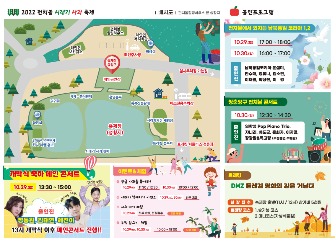 이 외에도 사과홍보관, 시래기융복합사업단, 농촌체험마을, DMZ경제순환센터, 새마을부녀회 먹거리, 분식 및 카페, 타로상담, 농특산물 판매 및 택배접수 등 다양한 부스를 운영하여 볼거리, 먹거리, 즐길거리도 다양하게 갖춰질 예정이다.