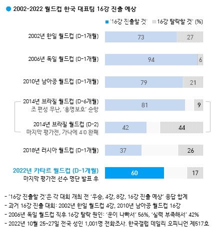 한국갤럽은 월드컵에서 우리 축구 대표팀이 어느 정도 성적을 거둘 것이라고 보는지 물은 결과 '우승' 2%, '4강' 8%, '8강' 14%, '16강' 36% 등으로 나타났다. 사실상 16강은 60%로 나타났다. 카타르 월드컵에서 우승 가능성 높은 국가로는 현재 FIFA 랭킹 1위 '브라질'19%, 그다음은 '독일' 8%, '프랑스' 5% 순으로 나타났다.