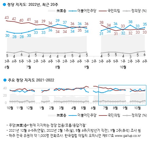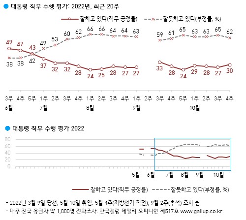 한국갤럽이 2022년 10월 넷째 주 정기조사를 발표했다. 윤석열 대통령이 현재 대통령으로서의 직무를 잘 수행하고 있다고 보는지 잘못 수행하고 있다고 보는지 물은 결과 긍정평가는 30% 부정평가는 62%로 나타났다. 10월 한 달간 대통령 직무 긍정률 평균은 29%, 부정률은 63%다.