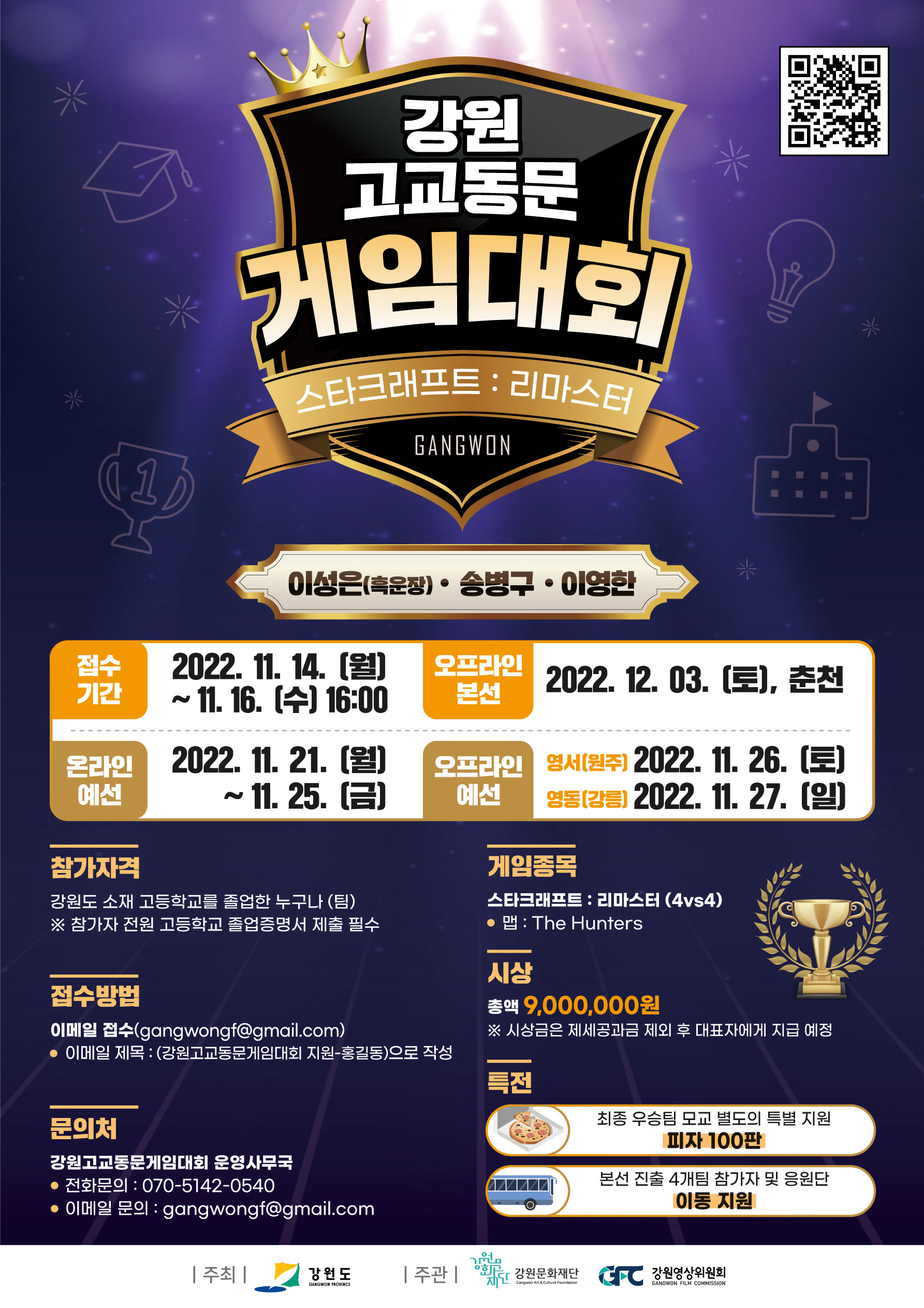 ‘강원 고교동문 게임대회’ 참가 신청은 11월 14일부터 11월 16일까지 이메일(gangwonggf@gmail.com)을 통해 제출하면 되며, 참가신청 서류는 강원문화재단(www.gwcf.or.kr) 및 강원영상위원회(www.gwfilm.kr) 공지를 통해 확인 가능하다.
