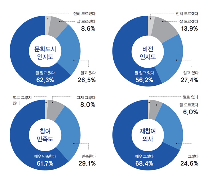 영월군민 446명을 대상으로 질문한 결과 군의 문화도시 추진을 인지한 주민은 70.4%, 문화도시 영월의 비전인 ‘시민행동으로 빛나는 문화충전도시 영월’을 아는 경우는 61.9%였다. 문화도시 추진에 많은 영월군민이 관심이 두고 있다는 것을 보여주는 결과라고 할 수 있다.