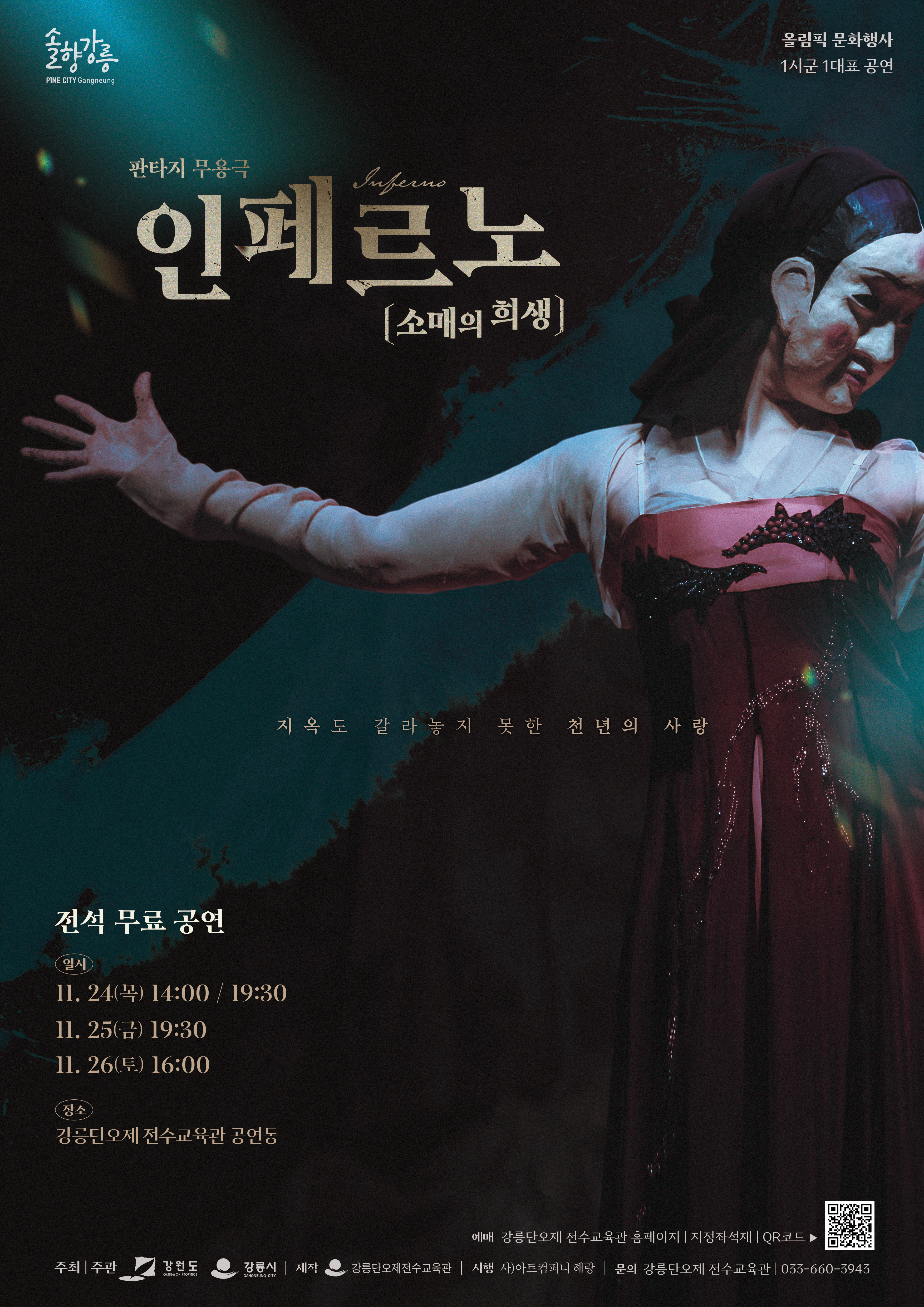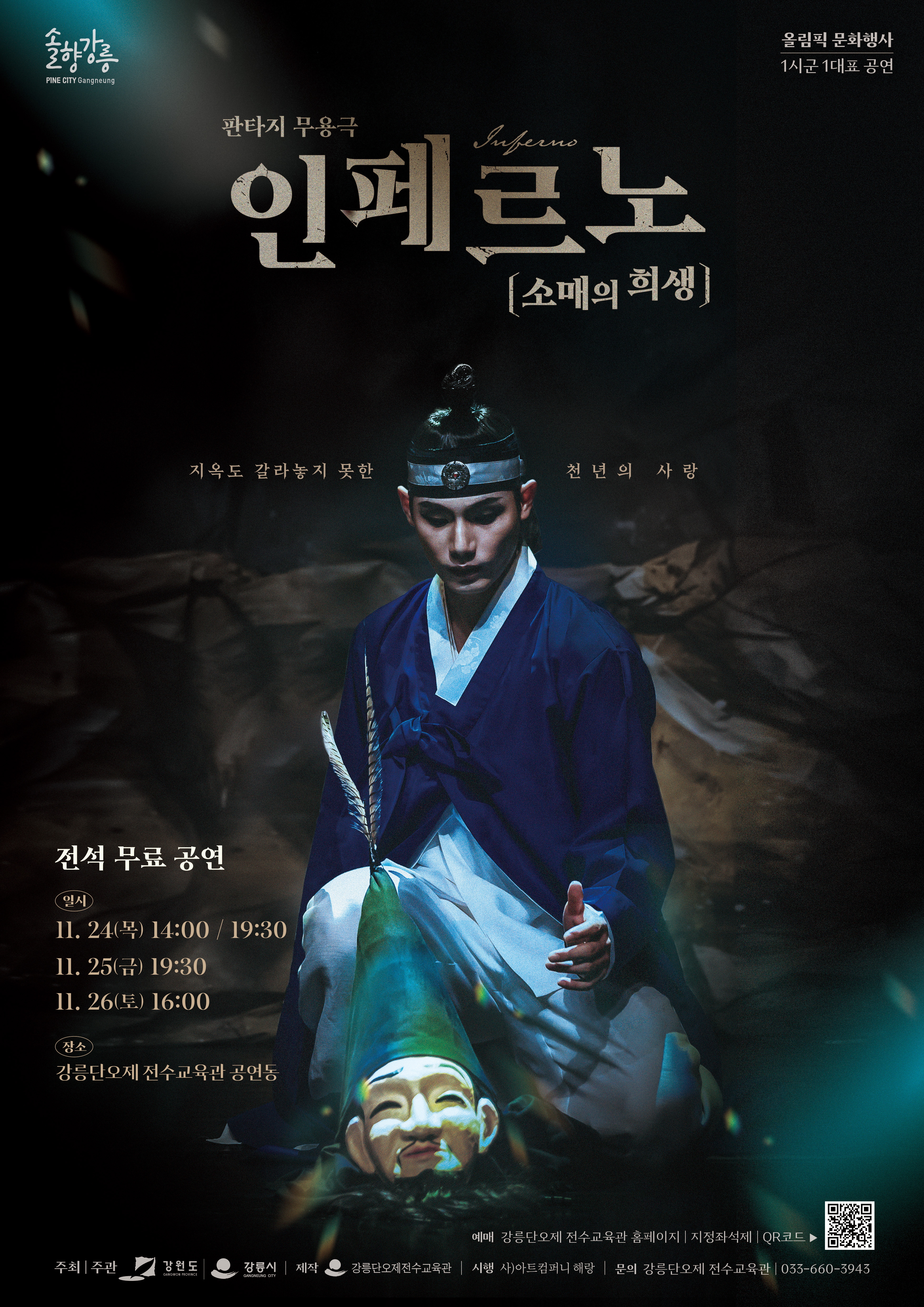 강릉단오제전수교육관은 판타지 무용극 「인페르노:소매의희생」을 강릉단오제전수교육관 공연동에서 24일(목)부터 26일(토)까지 공연한다.