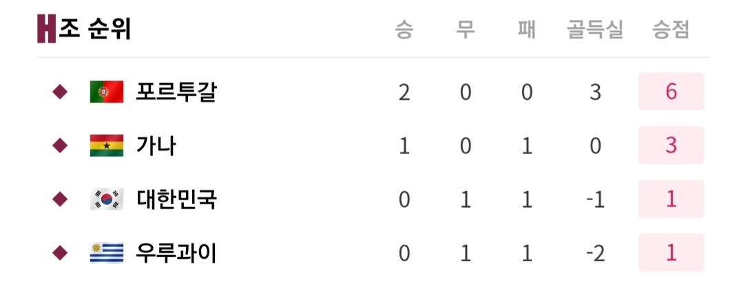 3.대한민국이 포르투갈을 이기고, 우루과이가 가나와 비길 경우 : 가나와 골득실 등 따져야하는데 불리