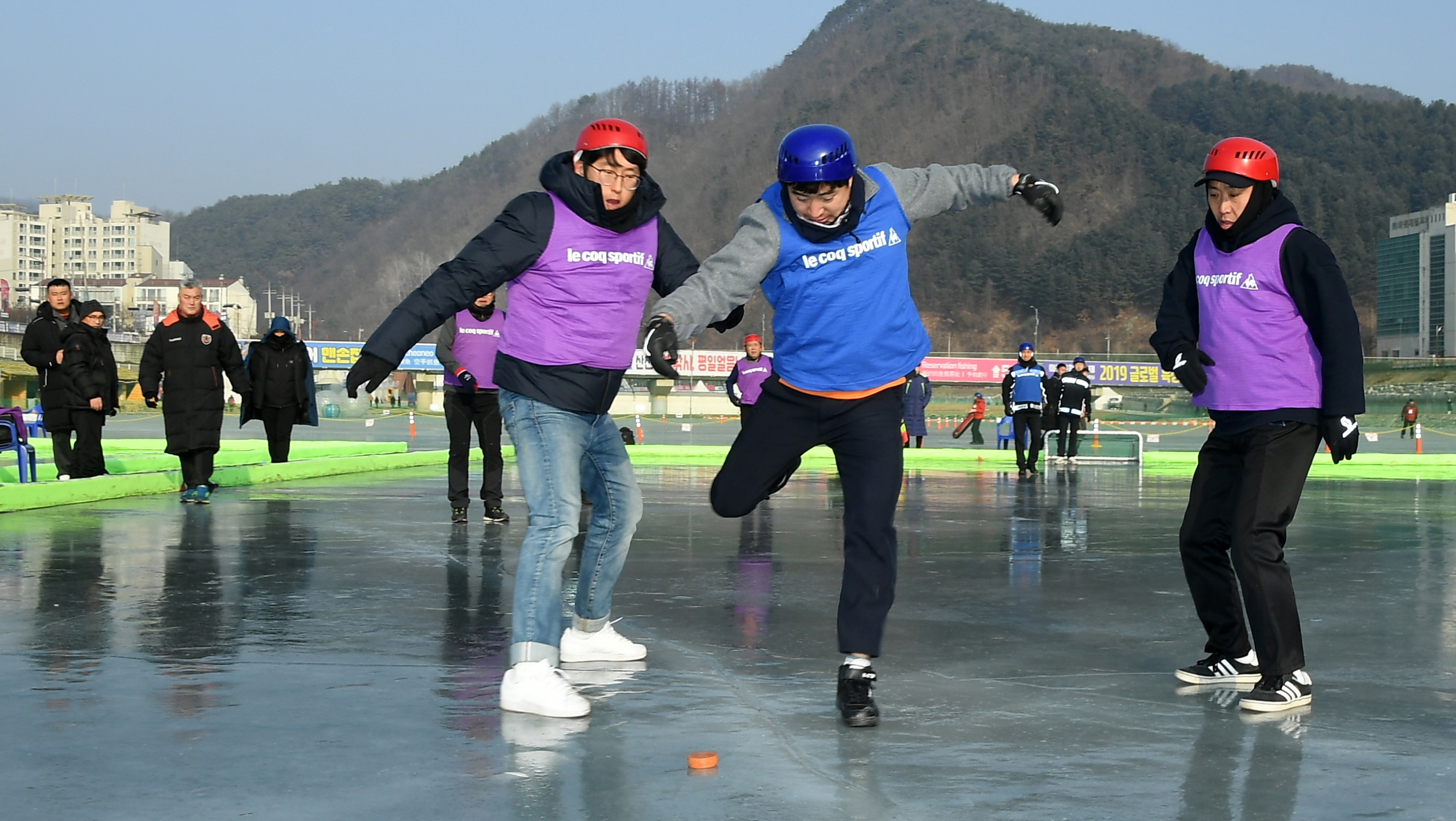 얼음축구대회는 빙판 위에서 안전장구를 착용한 5명이 1팀을 이뤄 상대방과 겨루는 단체 스포츠다.