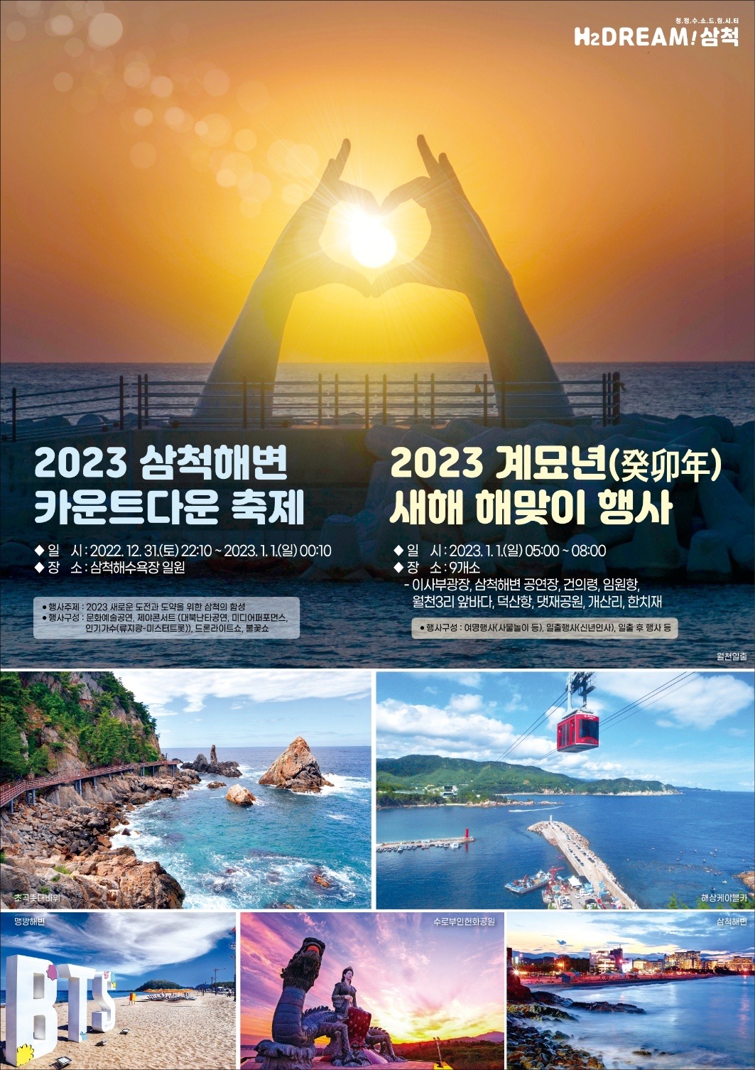 특히, 2022년 마지막 날인 12월 31일 저녁 10시부터 자정까지는 삼척해수욕장 삼척해변 내에서 불꽃놀이&레이저쇼, 카운트다운 세리머니, 축하 콘서트, 이벤트 행사 등 2023삼척해변 카운트다운 축제가 진행되며, 삼척해변 공원에는 빛 조형물을 설치하여 방문한 시민과 관광객들에게 볼거리도 제공할 계획이다.
