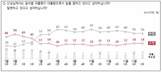 윤석열 대통령 긍정 34%, 부정 56%...30%대 초반을 벗어나지 못해 본문