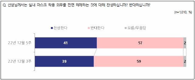실내 마스크 전면 해제에 대해 ‘반대한다’가 57%로 ‘찬성한다’ 41%보다 높게 나타나 지난주와 비슷한 결과를 보였다.