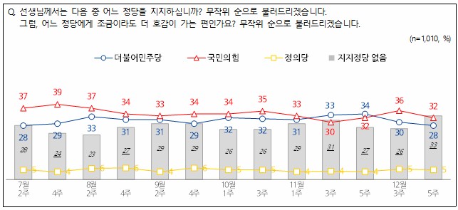 정당지지도는 ‘국민의힘’ 32%, ‘더불어민주당’ 28%, ‘정의당’ 5% 등의 순으로 나타나지난주와 비교해 국민의힘, 더불어민주당 모두 소폭 떨어진 것으로 나타났다.