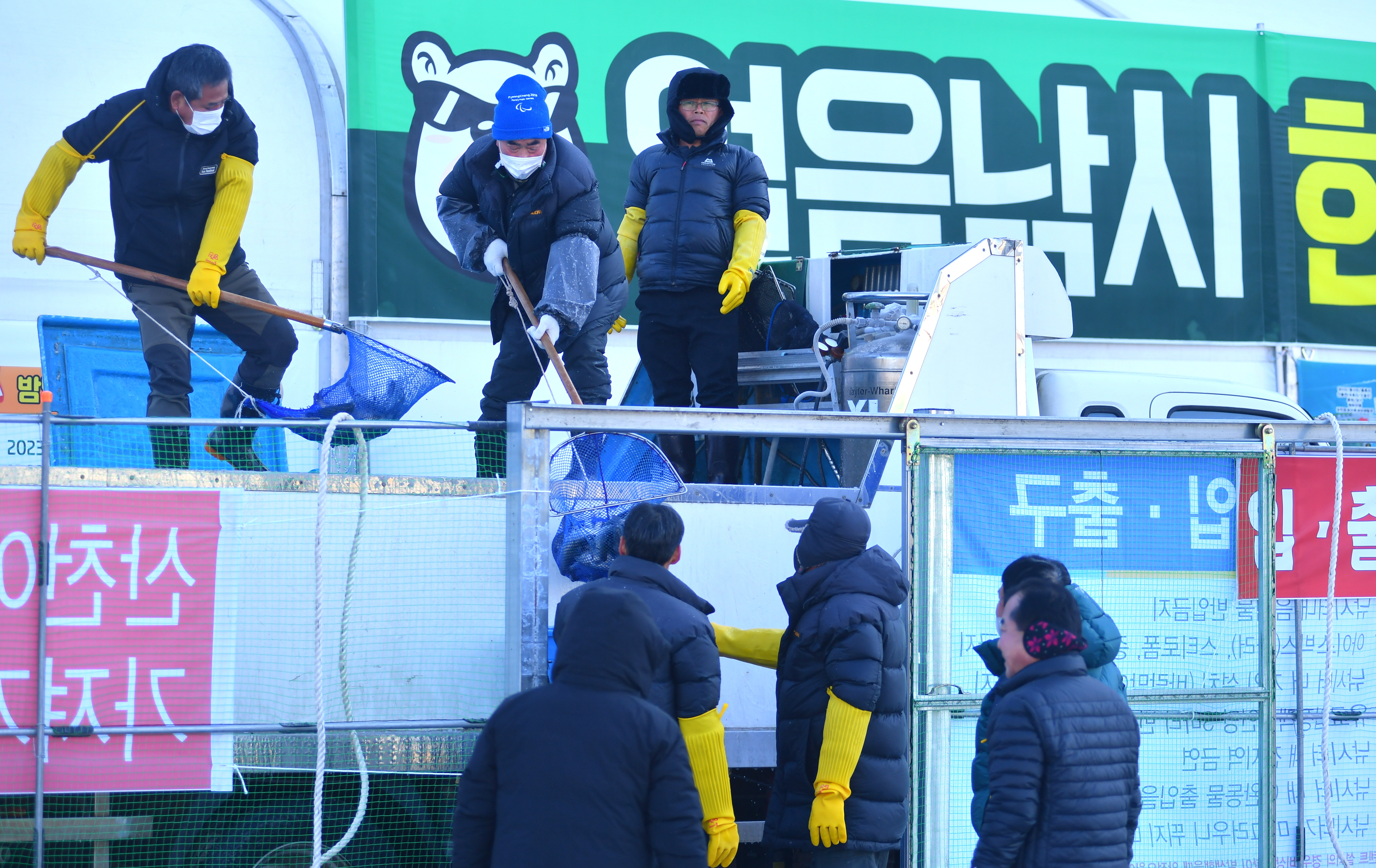 2023 화천산천어축제 개막을 사흘 앞둔 4일, 축제장 현장 낚시터에 산천어들이 사전 방양되고 있다. 수온 등 적응을 마친 싱싱한 산천어는 개막일인 7일 관광객들과 3년 만에 만나게 된다.