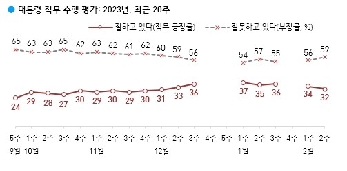 한국갤럽이 2023년 2월 둘째 주 전국 만 18세 이상 1,002명에게 윤석열 대통령이 현재 대통령으로서의 직무를 잘 수행하고 있다고 보는지 잘못 수행하고 있다고 보는지 물은 결과, 긍정 평가 32%, 부정 평가 59%로 나타났다.
