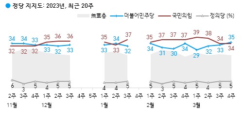 정당 지지도: 더불어민주당 35%, 국민의힘 34%