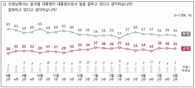 윤석열 대통령 긍정평가 35%, 부정평가 55% 본문