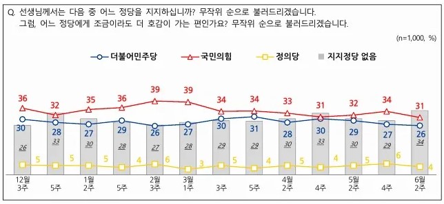 정당지지도는 ‘국민의힘’ 31%, ‘더불어민주당’ 26%, ‘정의당’ 4% 등의 순으로 나타났다. 국민의힘은 전주보다 3%, 더불어민주당도 전주보다 1% 하락했다.