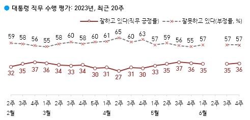 윤석열 대통령이 현재 대통령으로서의 직무를 잘 수행하고 있다고 보는지 잘못 수행하고 있다고 보는지 물은 결과, 긍정 평가는 36%이고 부정평가는 57%로 나타났다.