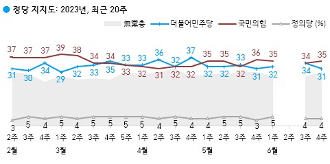 현재 지지하는 정당은 국민의힘 35%, 더불어민주당 31%, 지지하는 정당 없는 무당층 29%, 정의당 4%다.